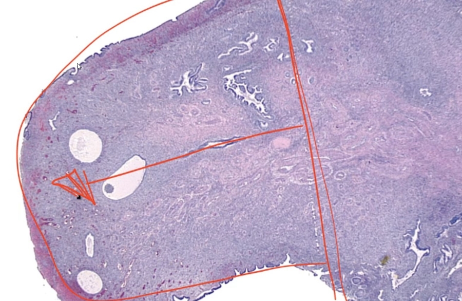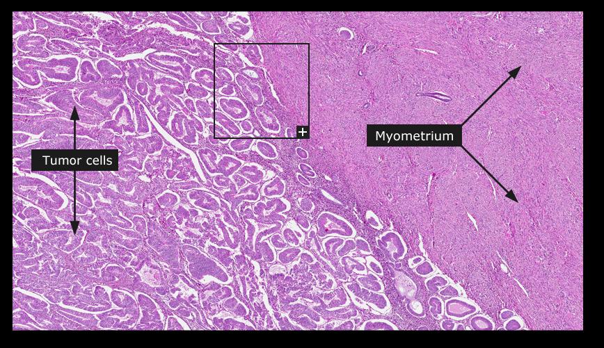 _The prognosis of endometrial carcinoma correlates with degree of myometrial invasion (the deeper it invades, the worse the prognosis). Think of its progression as an uncontrolled proliferative (follicular) phase of menstrual cycle: Normal endometrium transforms into simple hyperplasia, which transforms into complex hyperplasia, then atypical hyperplasia, and finally results in endometrial adenocarcinoma.