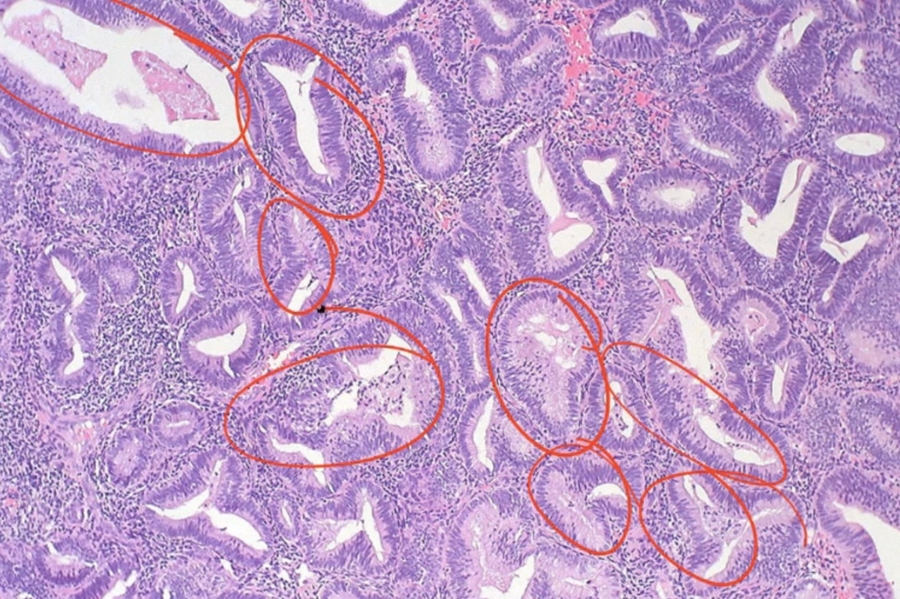 _Endometrial hyperplasia is the abnormal proliferation of endometrial glands relative to stroma; usually caused by excess unopposed estrogen stimulation (obesity, PCOS, estrogen replacement)
