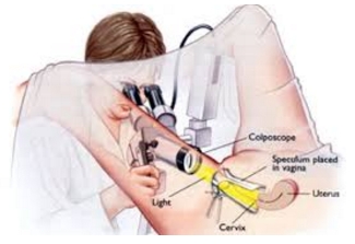 Abnormal pap smear is followed with colposcopy and biopsy. Colposcopy: