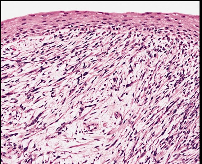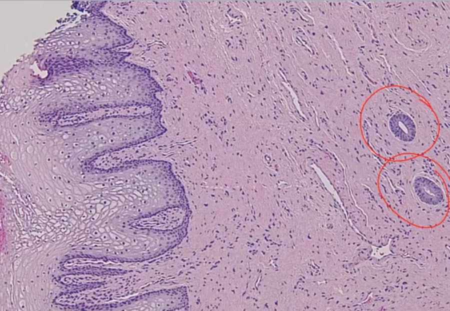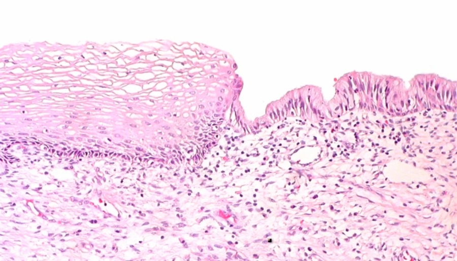 High grade dysplasia (carcinoma in situ) in the uterine cervix. The abnormal epithelium is extending into a mucus gland to the left of centre. This disease can progress to invasive cancer (squamous cell carcinoma) of the cervix: