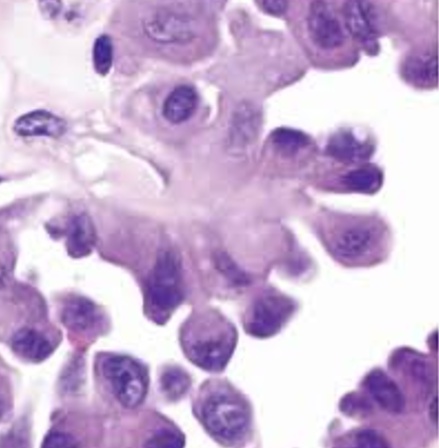 Normal (left) and abnormal pap smear. Normal: small nucleus to cytoplasm ratio, pink color.
