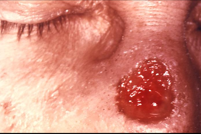 syphilis: painless, non-exudative, clean, hard base with indurated margins ("punched out base with rolled edges").