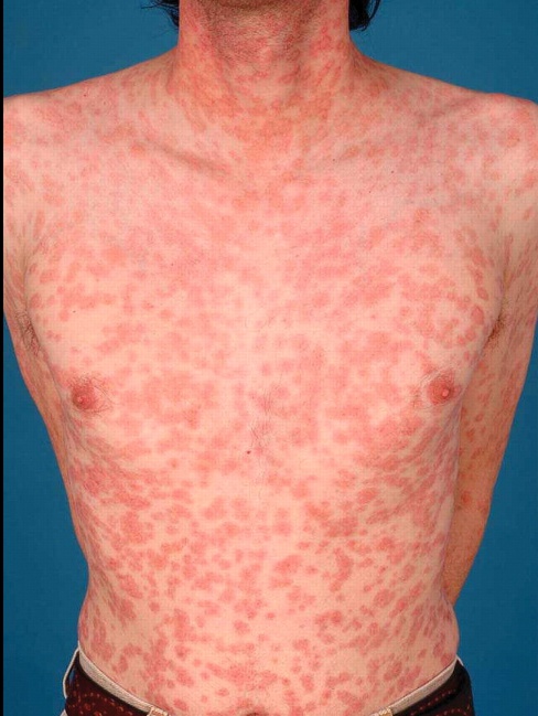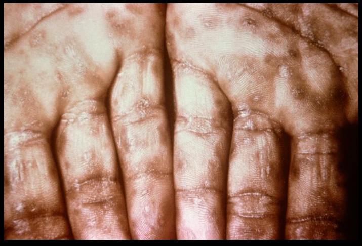 Maculopapular rash described as discrete copper, red or reddish-brown on the trunks and extremities, notably on the palms and soles.