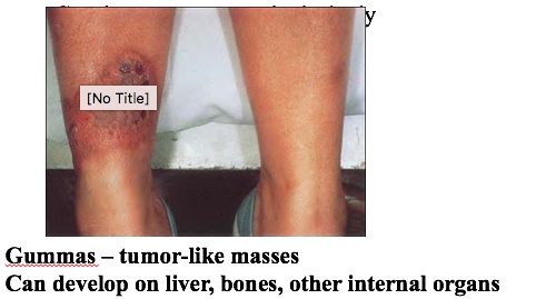 _ is characterized by a gumma that can occur in the skin, bones, and internal organs. On the skin, gummas present as ulcers or granulomatous lesions with a round, irregular shape. Visceral gummas may present as a mass lesion. Gummas are usually absent of any causative organisms.