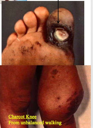 Charcot joints, a neuropathic arthropathy noted by the bony destruction and deformity of joints in this case due to decreased proprioception.