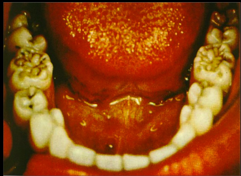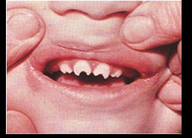 Oropharynx abnormalities such as hutchinson teeth and mulberry molars.