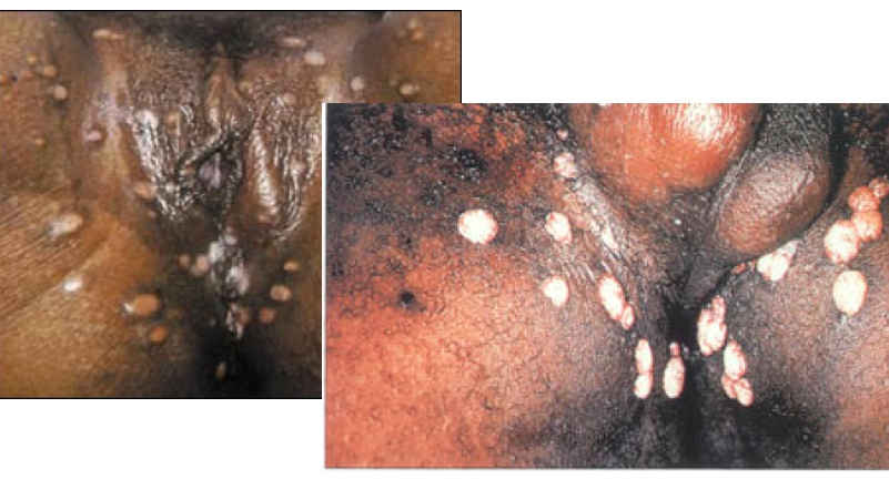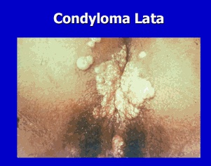 _Contrast the wet, raised, gray to white lesions of condyloma lata (secondary syphilis) with condyloma accuminata (HPV infection), which is characterized by raised, cauliflower-like, bulky, dry lesions around genitalia.
