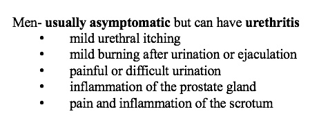 _Men infected are usually asymptomatic and often spontaneously resolves. Symptomatic patients may present with signs of urethritis.