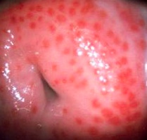 Vaginal exam of women infected shows an erythematous, "strawberry" cervix.
