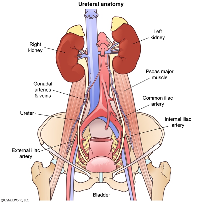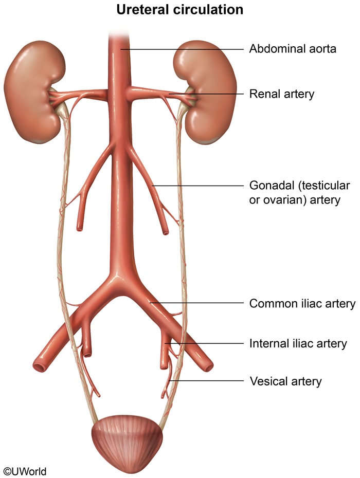 The blood supply to the proximal ureter comes from branches of the renal artery. At the distal ureter, arterial blood supply arises from the superior vesical artery. In between, the arterial supply to the ureter is anastomotic and highly variable, with possible afferent branches from the gonadal, common and internal iliac, aorta, and uterine arteries.