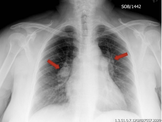 The chest x-ray in primary pulmonary hypertension reveals enlargement of the pulmonary arteries and right ventricle, which is not evident in this patient.