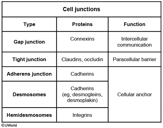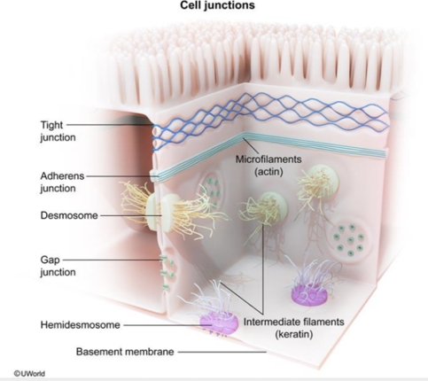(Choice C) Intermediate junctions (zonula adherens) are a delicate network of cytoplasmic filaments that radiate from the cell membrane to hold adjacent cells together. Intermediate junctions are the second component of the junctional complex.