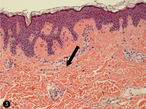 Light microscopy of a sample from a vesicle base reveals intranuclear inclusions in keratinocytes and multinucleated giant cells(positive Tzanck smear). Skin biopsy would show acantholysis (loss of intercellular connections) of keratinocytes and intraepidermal vesicles.