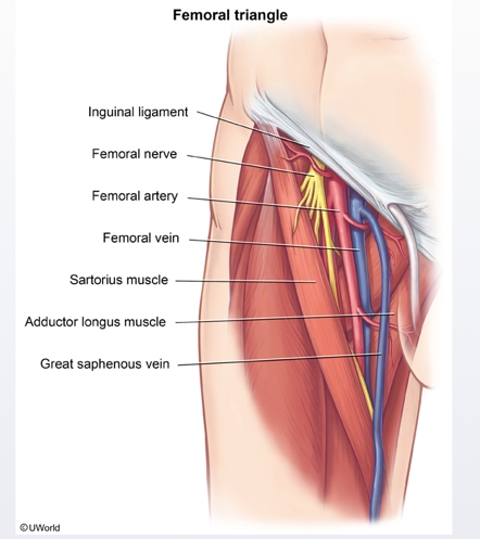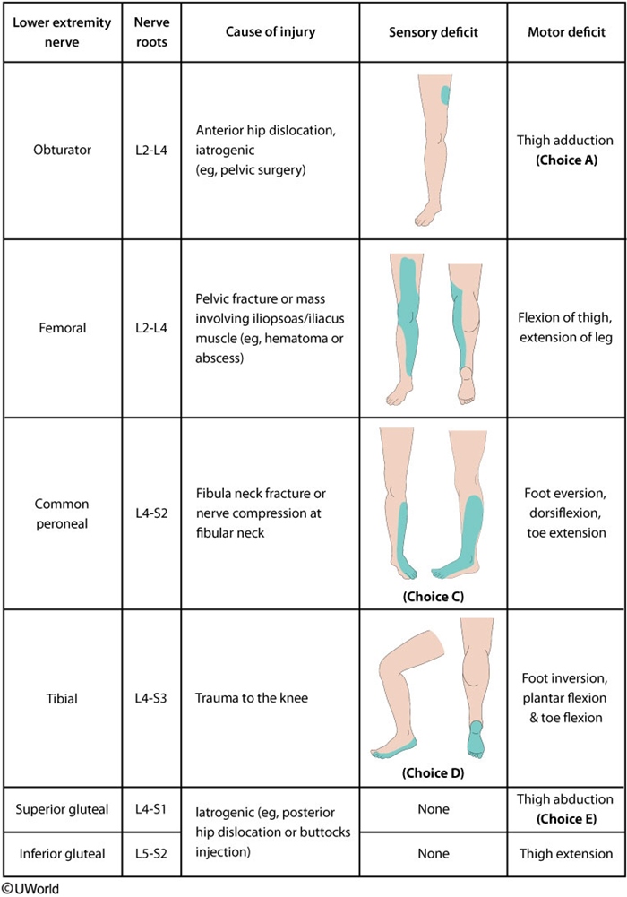 The femoral nerve descends through the fibers of the psoas major muscle, emerges laterally between the psoas and iliacus muscle, and then runs beneath the inguinal ligament into the thigh. Femoral nerve mononeuropathy can occur due to trauma (eg, pelvic fracture), compression from a hematoma or abscess, stretch injury, or ischemia. Patients with femoral neuropathy develop weakness involving the quadriceps muscle group and may have weakening of the iliopsoas with more proximal nerve injuries. They often complain of difficulty with stairs and frequent falling secondary to "knee buckling." On examination, the patellar reflex is generally diminished. In addition, sensory loss over the anterior and medial thigh and medial leg is typical. Acute, severe pain in the groin, lower abdomen, or back may also occur if the neuropathy is caused by a retroperitoneal hematoma.