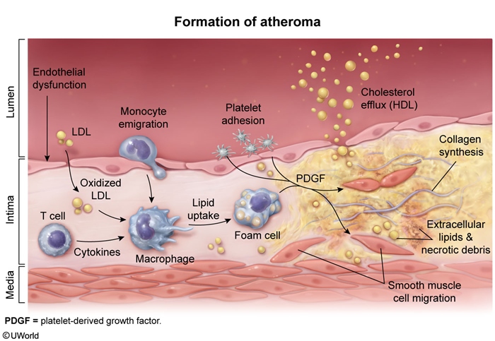 Thrombosis of atherosclerotic plaques involving the cerebral arteries can result in vessel occlusion with tissue hypoxia and subsequent necrosis. Ischemic neuronal injury initially causes intense cytoplasmic eosinophilia ("red neurons") followed by neutrophil infiltration a day later. After several days, macrophages/microglia are recruited to phagocytize the necrotic debris and predominate in the ensuing 2-3 weeks. Around this time, the periphery of the necrotic area becomes populated with new blood vessels and proliferating astrocytes that form a network of cytoplasmic extensions (reactive gliosis). Several months to years after brain infarction, the necrotic area appears as a cystic cavity surrounded by a wall composed of dense fibers formed by astrocytic processes (glial scar).