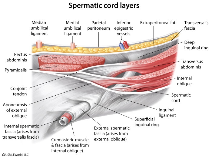 Testicles develop in the fetal abdomen during organogenesis. Between 8 weeks and full term, they slowly descend into the scrotum by passing from the abdomen through the deep inguinal ring to enter the inguinal canal. The deep inguinal ring is a physiologic opening in the transversalis fascia bounded by the transversus abdominis muscle laterally and the inferior epigastric vessels medially. The testis then passes anteromedially to exit the canal via the superficial inguinal ring, which is formed by an opening in the external oblique muscle aponeurosis above and medial to the pubic tubercle. Once it has passed through the superficial inguinal ring, the testis enters the scrotum.