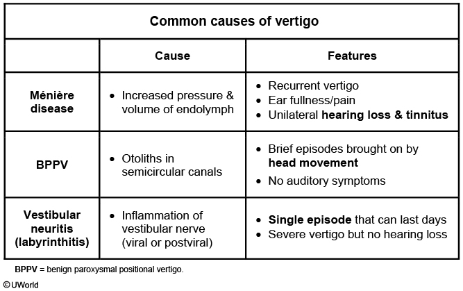 (Choice C) Labyrinthitis is inflammation of the vestibular nerve that causes acute-onset vertigo, nausea, and vomiting. It usually occurs in a single episode following a viral syndrome.