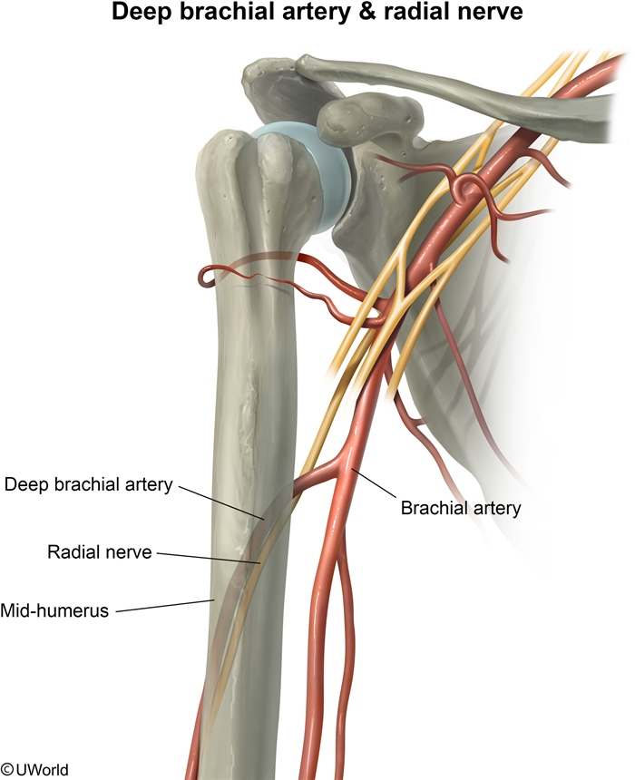 Radial nerve deficits in the setting of a midshaft humeral fracture should raise concern for an associated injury to the deep brachial artery. The deep brachial (also termed profunda brachii) artery branches off the brachial artery high in the arm, passes inferior to the teres major muscle, and courses posteriorly along the humerus in close association with the radial nerve.