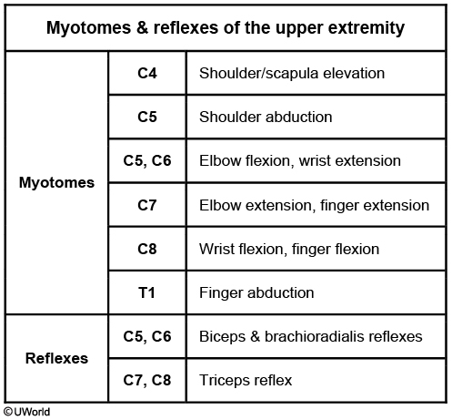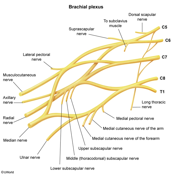 This patient is exhibiting signs of radial nerve injury (eg, wrist drop). The radial nerve is a terminal branch of the brachial plexus that carries fibers originating in the C5-T1 nerve roots. It innervates most of the forearm extensors at the elbow (eg, triceps) and most of the hand extensors at the wrist. It also innervates the extrinsic extensors of the digits and the brachioradialis and supinator muscles. The radial nerve also provides cutaneous sensory innervation to the dorsal hand, forearm, and upper arm.