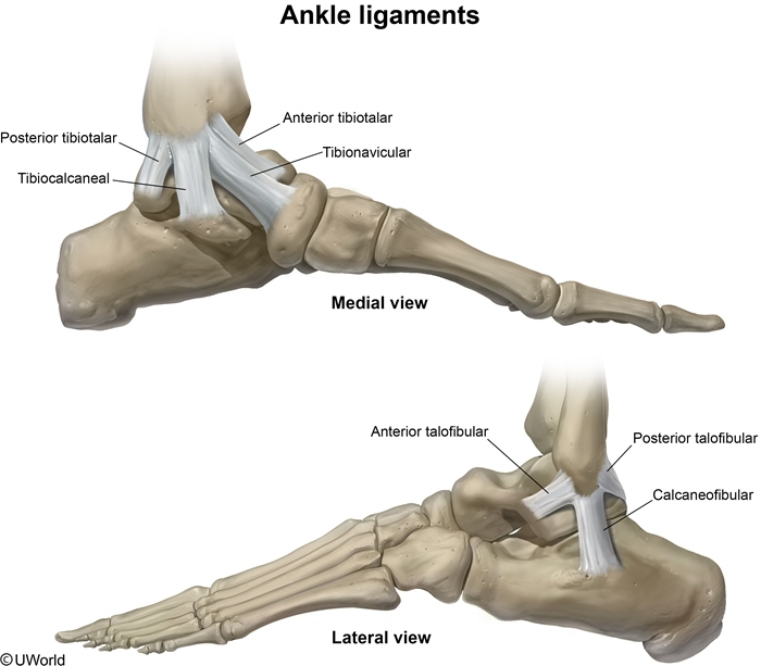 This patient has a right lateral ankle sprain, which is most often due to inversion of a plantar-flexed foot. The ankle is stabilized laterally by the anterior inferior tibiofibular, anterior talofibular, posterior talofibular, and calcaneofibular ligaments (bottom image).