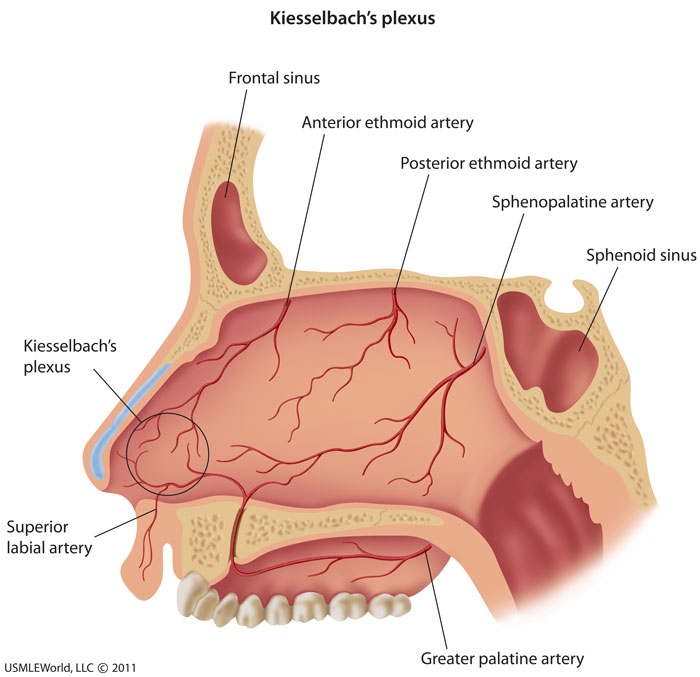 The nasal mucosa is highly vascular and easily irritated by trauma (eg, nose-picking), mucosal dryness, foreign body insertion, and rhinitis (eg, allergy, infection). Epistaxis is very common in children and may be classified as anterior or posterior, depending on the bleeding source. Anterior nosebleeds are by far the most common, and the vast majority occur within the vascular watershed area of the nasal septum (anteroinferior part of the nasal septal mucosa) known as Kiesselbach plexus. Anastomosis of the following vessels occurs in this region: