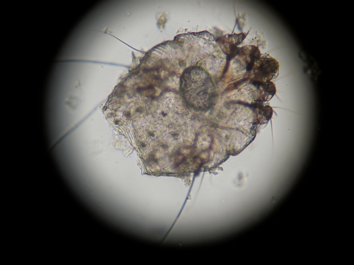 Skin examination usually shows excoriations with small, crusted, red papules scattered around the region. Patients can also develop small vesicles, pustules, or wheals. Linear burrows are the most specific finding in scabies, although they are often obscured by excoriations. Diagnosis is confirmed by skin scrapings from excoriated lesions that show mites, ova, and feces under light microscopy, as shown in the image above.
