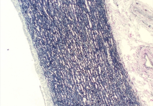 Myxomatous changes (pathologic weakening of connective tissue) in the media of large arteries are found in cystic medial degeneration. Medial degeneration is characterized by the fragmentation of elastic tissue ("basket weave" pattern, compared tonormal) and separation of the elastic and fibromuscular components of the tunica media by small, cleft-like spaces that become filled with amorphous extracellular matrix (white arrow).