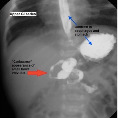 Incomplete counterclockwise rotation (eg, 180 degrees) will result in midgut malrotation. The cecum will rest in the right upper quadrant instead of the right lower quadrant (RLQ). Additionally, Ladd's (fibrous) bands connect the retroperitoneum in the RLQ to the right colon/cecum by passing over the second part of the duodenum, causing intestinal obstruction in the process. Obstruction manifests as bilious emesis during the first days of life. In addition, because the mesenteric base is abnormally narrowed, the mesentery is vulnerable to twisting around the superior mesenteric artery. The twisting, referred to as midgut volvulus, compromises intestinal perfusion and may lead to life-threatening bowel necrosis.