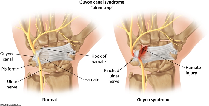 The ulnar nerve is most commonly injured at the elbow ("funny bone") due to trauma or nerve compression, but it can also be injured at the wrist as it runs through Guyon's canal. Nerve damage may cause sensory loss in the ulnar distribution with weakness on wrist flexion/adduction, finger abduction/adduction, and flexion of the fourth/fifth digits. The hypothenar eminence can appear flattened due to denervated muscle atrophy. Weakness of the lumbricals in the fourth/fifth digits may also produce an "ulnar claw" deformity during finger extension.