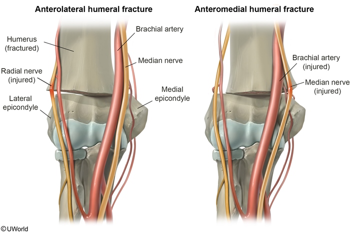 The brachial artery, median nerve, and radial nerve all run anterior to the elbow with the brachial artery and median nerve running together medially and the radial nerve running laterally. Due to this configuration, supracondylar fractures resulting in anterolateral displacement of the proximal fracture fragment typically cause radial nerve injury. This causes wrist drop (due to denervation of hand/finger extensor muscles) and sensory loss over the posterior forearm/dorsolateral hand.