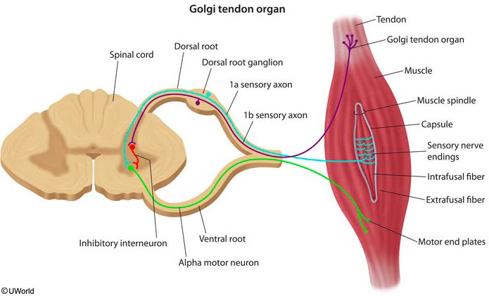 The Ib sensory axons from the GTOs contact inhibitory interneurons in the spinal cord, which in turn synapse with the α motor neurons that innervate the same muscle. Thus, the Golgi tendon circuit is a negative feedback system that regulates and maintains muscle tension. When a muscle exerts too much force, the GTOs inhibit contraction of the muscle, causing sudden muscle relaxation. This prevents damage to the musculoskeletal system.