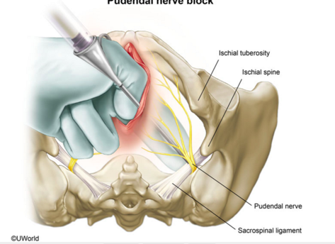 Important landmarks for a PN block include the ischial spines and sacrospinous ligament. The ischial spines are bony protrusions located posterolateral to the vaginal sidewall. The sacrospinous ligament is a firm band that runs medially and posteriorly from the ischial spine to the sacrum. When administering a PN block, the ischial spines should be palpated intravaginally, and the anesthetic should be injected medially in very close proximity to the ischial spine through the sacrospinous ligament.