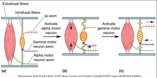 Alpha motor neuron comes from corticospinal, activates extrafusal fibers. Gamma motor neuron activates intrafusal fiber and keeps spindle activated to keep a constant 1a signal.