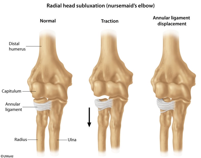 This patient is experiencing radial head subluxation (nursemaid’s elbow), the most common elbow injury in children. It occurs most frequently between the ages of 1 to 4 years. This injury often results from a sharp pull on the hand while the forearm is pronated and the elbow is extended. The sudden increase in axial traction on the proximal radius causes the annular ligament to tear from its periosteal attachment at the radial neck. It then slips over the head of the radius and slides into the radiohumeral joint, where it becomes trapped. By age 5, the annular ligament becomes thick and strong, decreasing the likelihood that it can be torn or displaced.
