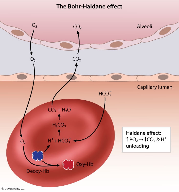 When deoxygenated blood enters the alveolar capillaries of the lung, the rise in pO2 increases the binding of oxygen to hemoglobin and causes the release of H+ and CO2 from hemoglobin (Haldane effect). As bicarbonate shifts back into the erythrocytes in exchange for chloride, carbonic anhydrase converts H+ and bicarbonate ions back into CO2 and water. The CO2 is then excreted through the lungs.