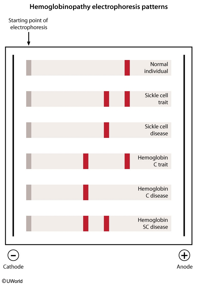 Patients with sickle cell disease have HbS mutations in both beta chains; those with HbC disease have HbC mutations involving both beta chains. Patients with hemoglobin SC disease have 1 HbS allele and 1 HbC allele and will have 2 hemoglobin bands on electrophoresis. This patient's electrophoresis results show a single band that migrates less than the HbA and HbS bands, meaning that he has HbC disease. Patients with HbC disease are typically asymptomatic and often have mild hemolytic anemia and splenomegaly.