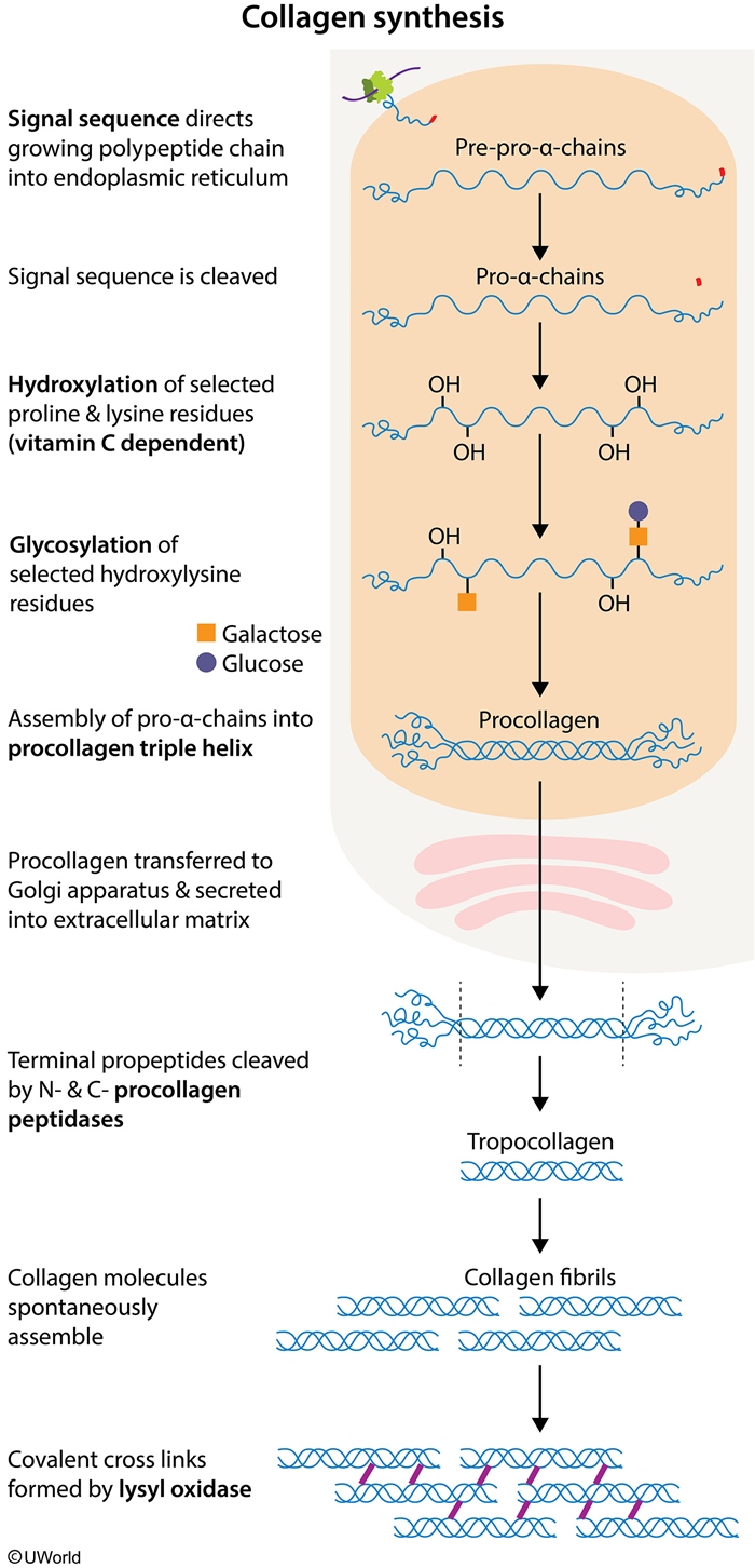 Multiple environmental factors, especially exposure to ultraviolet (UV) light, contribute to aging of the skin. UVB wavelengths are predominantly absorbed in the upper dermis and contribute to sunburn and increased risk of malignancy. UVA wavelengths penetrate deeper into skin and cause photoaging. UVA produces reactive oxygen species, which activate multiple inflammatory cell-surface receptors and nuclear transcription factors. This leads to decreased collagen fibril production, along with upregulation of matrix metalloproteinases (including collagenases) that subsequently degrade type I and III collagen and elastin.