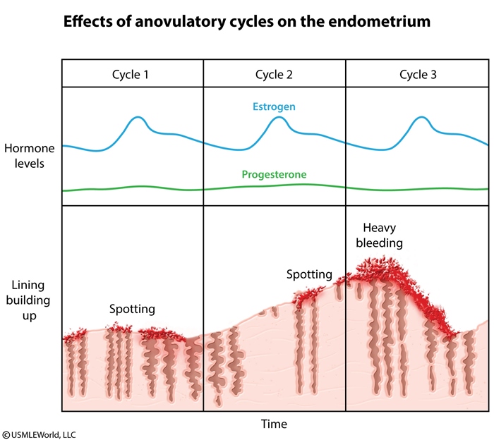 In most women age 20-40 years, menstrual cycles are consistent and last 24-35 days, with menstrual flow ranging from 4-6 days. However, adolescents typically have an immature hypothalamic-pituitary-ovarian axis for several years following menarche. During this time, they may have longer menstrual cycles and irregular bleeding patterns due to the presence of anovulatory cycles. In the absence of ovulation, the ovarian follicle does not degenerate and become a corpus luteum. As a result, no progesterone is produced and estrogen levels remain persistently high, causing the endometrium to remain in the proliferative phase. Chronically proliferative endometrium becomes disorganized and fragile with unstable venous capillaries, resulting in irregular periods of stromal breakdown with variable, but often heavy, bleeding.