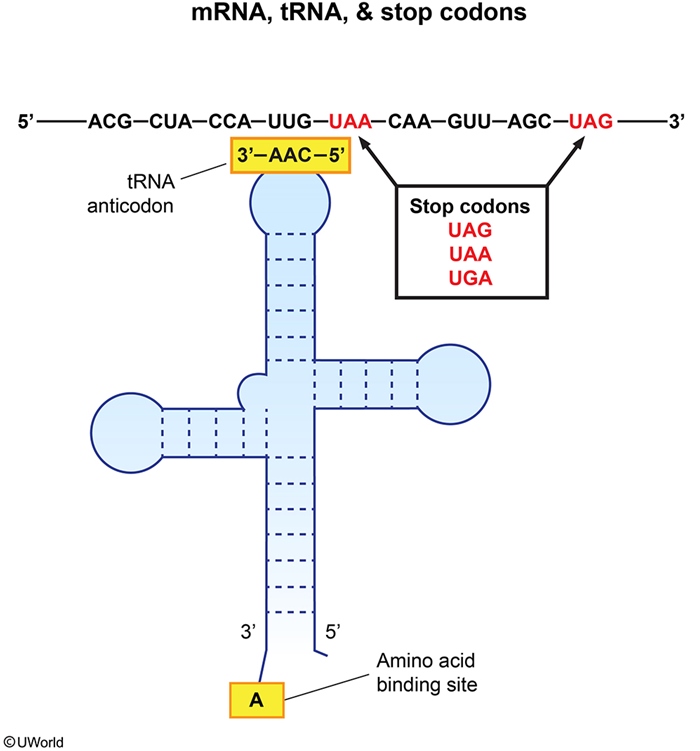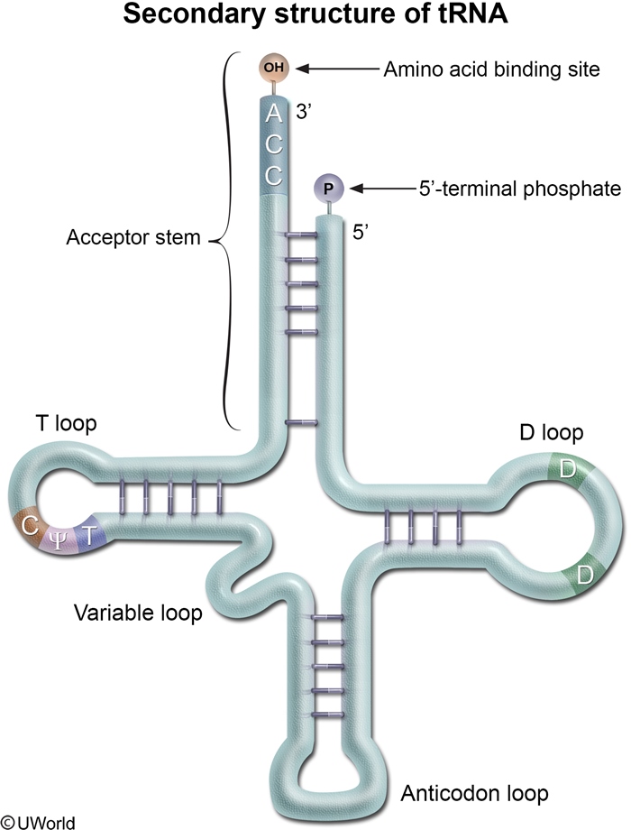 The acceptor stem is created through the base pairing of the 5'-terminal nucleotides with the 3'-terminal nucleotides. The CCA tail hangs off the 3' end, with the amino acid bound to the 3' terminal hydroxyl group. tRNA is "loaded" with the appropriate amino acid by aminoacyl tRNA synthetase. The acceptor stem helps mediate correct tRNA recognition by the proper aminoacyl tRNA synthetase.