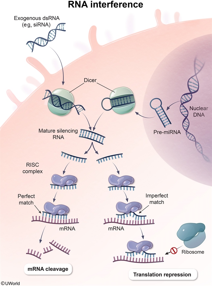 RNA interference is an important mechanism by which short (20-30 base pair) non-coding RNA sequences induce posttranscriptional gene silencing. Types of silencing RNA include small interfering RNA (siRNA) and microRNA (miRNA). The human genome encodes over 1000 miRNA genes, each one capable of repressing hundreds of target genes. Altered expression of even a few miRNA genes can lead to cellular dysregulation and has been implicated in the development of many diseases, including hematologic and solid malignancies. In addition, synthetic siRNA sequences can be introduced into cells to silence specific pathogenic genes (eg, c-Myc oncogene) and are being explored as possible therapeutic agents.