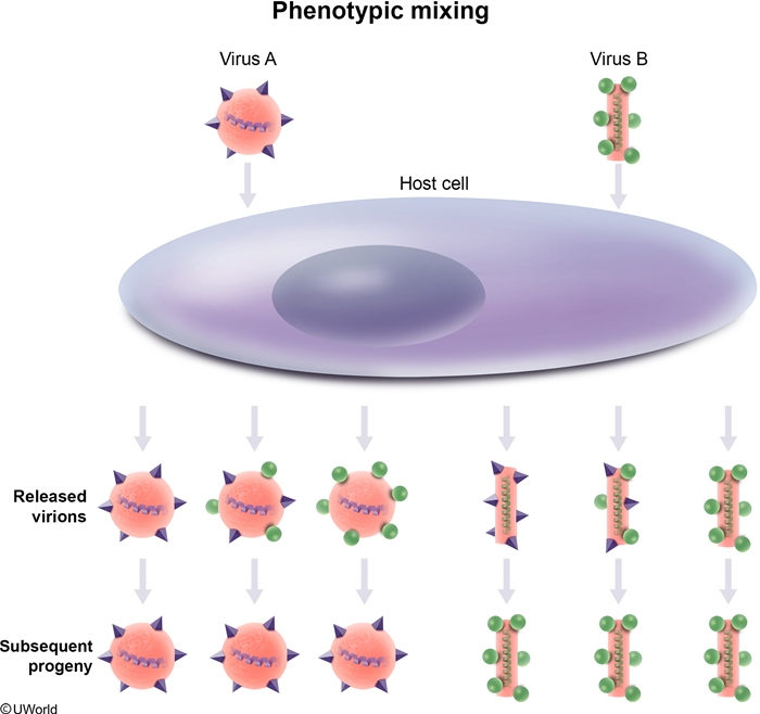 The acquisition of a new viral surface protein is often all that is necessary for a virus to infect a new type of host cell. In this scenario, avian and human influenza virus particles infect host pig cells; certain progeny avian virus particles obtain some of the surface components (eg, sialic acid receptors) of the human influenza virus, allowing the avian virus to infect human cells. This exchange is an example of phenotypic mixing, which generally occurs when a host cell is coinfected with 2 viral strains and progeny virions contain unchanged parental genome from one strain and nucleocapsid (or envelope) proteins from the other strain. However, because there is no change in the underlying viral genomes (no genetic exchange), subsequent progeny will revert to having only avian influenza type surface proteins and will again be noninfectious to human epithelium.
