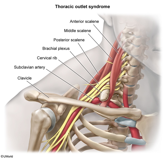 TOS most commonly occurs within the scalene triangle, which is formed by the anterior and middle scalene muscles and the first rib. The anterior scalene muscle originates from the C3-C6 transverse processes and attaches to the scalene tubercle of the first rib. The middle scalene originates from the C2-C7 transverse processes and inserts into the posterior first rib. The brachial plexus trunks and subclavian artery pass between the anterior and middle scalenes; the subclavian vein runs anteromedial to the triangle. TOS can be due to an anomalous cervical rib, scalene muscular anomalies, or injury (eg, repetitive overhead arm movements, trauma).