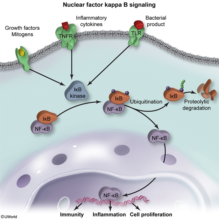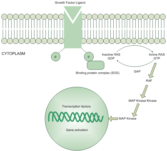 Growth factors can stimulate cell proliferation by altering the expression of certain genes in the nucleus. After a growth factor binds to its cell membrane receptor, signal transduction systems transfer the signal to the nucleus. Examples of signal transduction systems include: