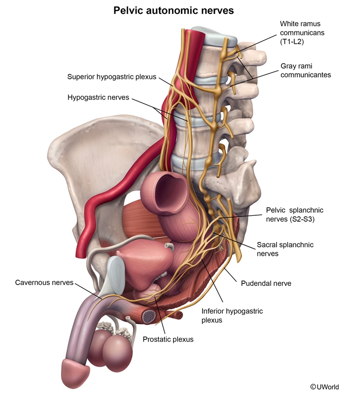 The prostatic plexus lies within the fascia of the prostate and originates from the inferior hypogastric plexus (which itself is a continuation of the hypogastric nerve with additional input from the pelvic and sacral splanchnic nerves). The lesser and greater cavernous nerves arise from the prostatic plexus and pass beneath the pubic arch to innervate the corpora cavernosa of the penis and urethra. The cavernous nerves carry post-ganglionic parasympathetic fibers that facilitate penile erection. Prostatectomy or injury to the prostatic plexus can cause erectile dysfunction; as a result, surgeons attempt to preserve the integrity of the prostatic fascial shell during surgery.