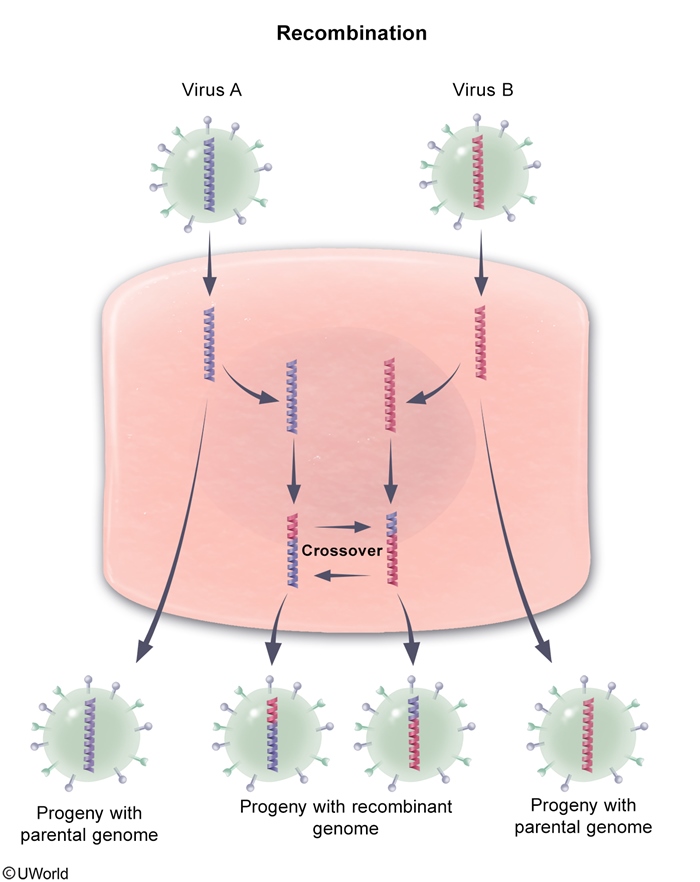 This scenario describes the exchange of genetic information between 2 virus strains that have nonsegmented, double-stranded DNA genomes. Recombination refers to the exchange of genes between 2 chromosomes via crossing over within homologous regions. The resulting progeny can have recombined genomes with traits from both parent viruses. In this case, the thymidine kinase genes in HSV type 1 and 2 virions are likely to have significant sequence similarity, allowing cross over to occur with relatively high frequency.