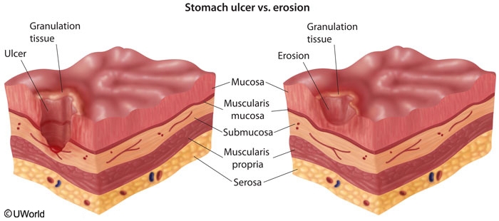 Gastric erosions are defined as mucosal defects that do not fully extend through the muscularis mucosa (ie, erosions are limited to the mucosal layer). Gastric ulcers, on the other hand, penetrate through the mucosal layer and extend into the submucosal layers.