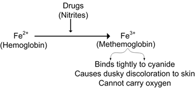 Methylene blue is indicated for treatment of methemoglobinemia, which presents with gray- or blue-colored skin, shortness of breath, and "chocolate-colored" blood. Methylene blue acts as an artificial electron transporter for reduction of methemoglobin through the NADPH pathway.