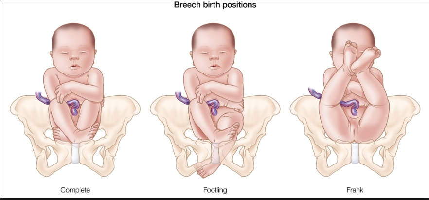 Frank breech makes up 75% of cases and presents with flexed hips and extended knees so that the feet are near the head. Mnemonic: Frank has his Feet in his Face.