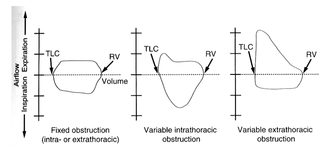 Three categories of upper airway obstruction may be defined on the basis of the flow- volume loop: 1) fixed obstruction, 2) variable intra-thoracic obstruction, and 3) variable extra- thoracic obstruction (you need to know these).