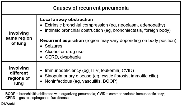 Recurrent pneumonia occurring in the same anatomic location of the lung raises suspicion for localized airway obstruction, which, if present, can lead to impaired bacterial clearance and predisposition to infection (eg, postobstructive pneumonia).